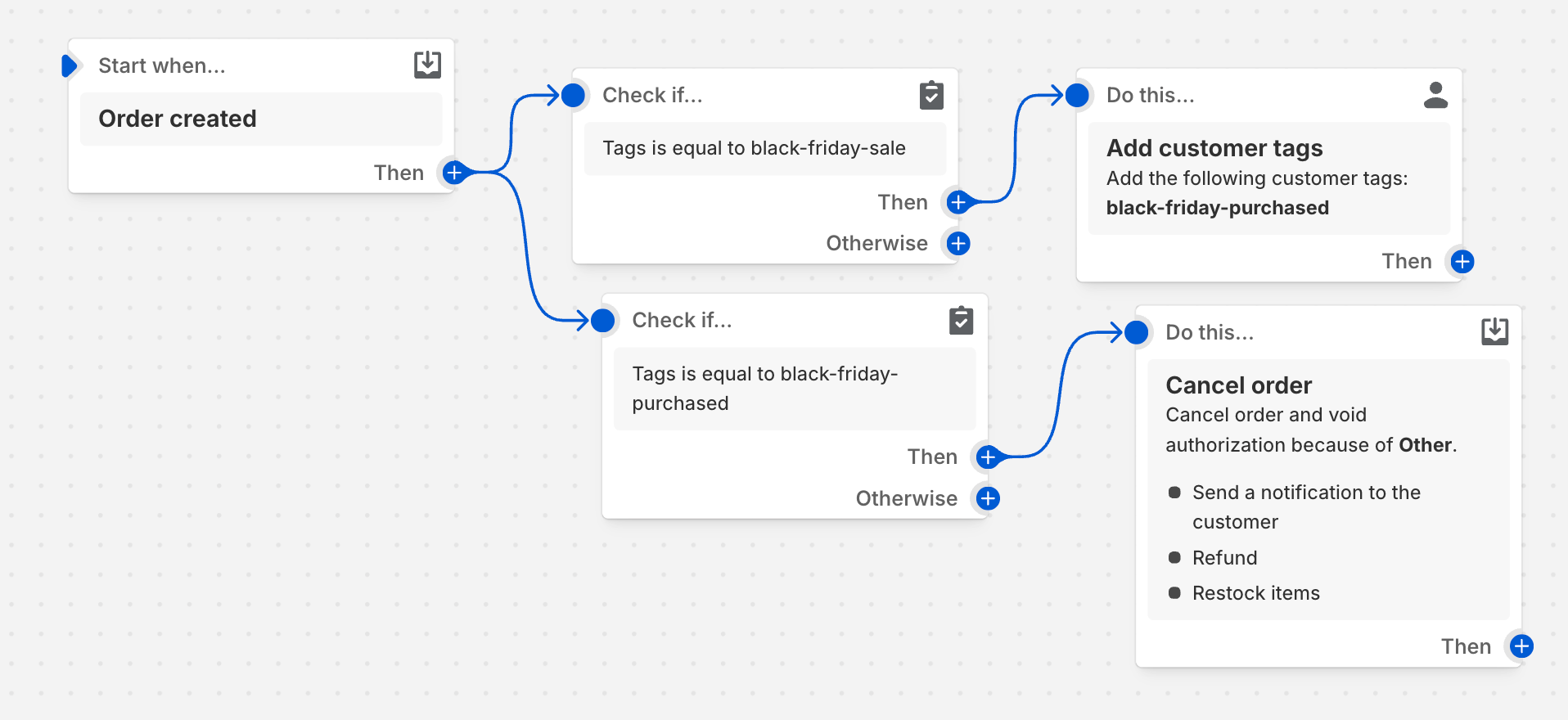 To take it a step further, they used Shopify Flow to tag customers after their purchase.This ensured the limit held even if someone refreshed the page or tried again later, since only logged-in customers could purchase the limited product, and those customers would already be tagged.